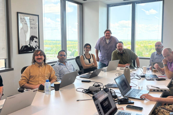 (From Left) Jaime Hernandez, Jacob Mann, Ravi Ledwani, Ghina Abokayass, Vice President of Application Services Bernie Pineau (standing), Michael Rosenthal, Brian DeRue, Michael Sorracco, Vice President of Growth Rachel De Geyndt